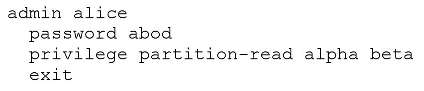 Given the following configuration, which statement describes Alice's partition access rights?