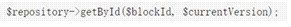 You are working on a custom page where the content of a CMS block has to be rendered. You know the merchant is using Staging for CMS blocks. In your code you have access to the $repository object which is an instance of \Magento\Cms\Api\BlockRepositoryInterface. $blockld which is the original block ID, and $current Version which is the current Staging version.
