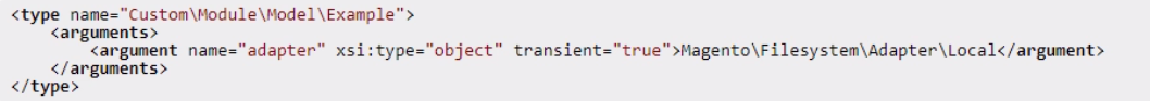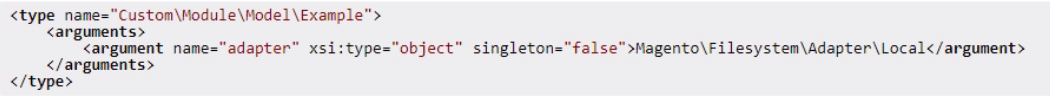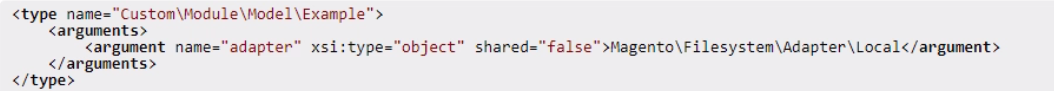 This configuration will ensure that all instances of the Custom\Module\Model\Example class will receive a new instance of the Magento\Filesystem\Adapter\Local class.
