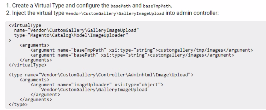 According to the ImageUploader component guide for Magento 2 developers, the ImageUploader UI component gives users the ability to upload images to the Magento Media Gallery. This component is a variation of the FileUploader component and uses the same configuration settings. The ImageUploader component uses the Magento\catalog\Model\iinageUploader class for image uploading, which has properties such as basePath and baseTmpPath that define where the images are stored. To extend the default imageuploader class and use it without affecting the other modules that are already using it, the developer needs to create a virtual type of this class in their module's di.xml file and specify different values for basePath and baseTmpPath. The developer also needs to inject their virtual type into their admin controller using the imageUploader argument. Therefore, option B is the correct answer, as it shows the correct di.xml and controller code to extend and use the imageuploader class. Verified Reference: https://devdocs.magento.com/guides/v2.3/ui_comp_guide/components/image-uploader/
