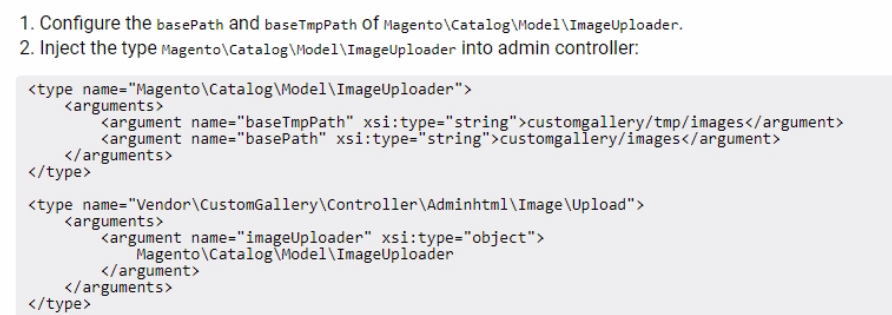 The module uses the Magento\catalog\Model\iinageUploader class for image uploading. The admin controller for custom image uploads is Vendor\CustomGallery\Controller\Adminhtml\Image\Upload.