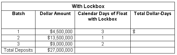 An analyst at XYZ Company was assigned with determining if the company should start to use a lockbox provider for its retail payments. The analyst determined that the company's annual sales of $324,000,000 were recorded evenly throughout the year. The Company receives 30,000 checks annually. Total dollar-days float without the lockbox is $76,500,000 and the annual opportunity cost is 5.5%; assume 30-day month. The industry's average opportunity cost is 6.0%. Using the information in the table, what would be the net effect of using the lockbox?
