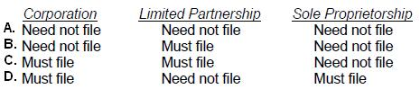 Choice 'c' is correct. A sole proprietorship can be formed without filing with the state. Formation of either a corporation or a limited partnership requires a filing.