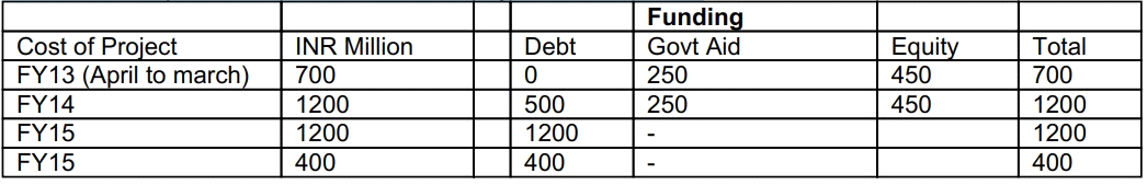 3. The power project is of 600 megawatts (MW) shall comprise 4 units of 150 MW each. The estimated cost of project is about INR3, 500 Million to be spent over a period of 4 year(s) the project is estimated to be commercially operational by April 1, 2016 with two units operational om same day and one unit each will be operational on April 1, 2017 and April 1, 2018.