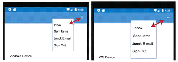 presentation [The image of this question includes a Flutter app interface run result as it appears on Android and on iOS emulators. When the app user taps the button on the app title bar, he/she will get a menu with some items.