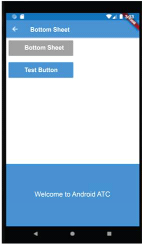 Assume that you designed a Flutter app as illustrated in the image of this question. When you tapped the "Bottom Sheet" button, you got a bottom sheet including the text "Welcome to Android ATC".
