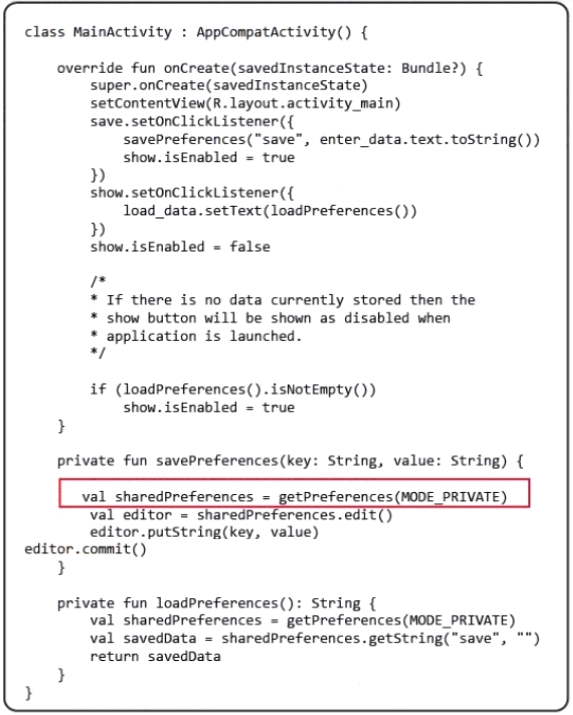 In the following image of code, what is the purpose of using MODE_PRIVATE in the method getPreferences( )?