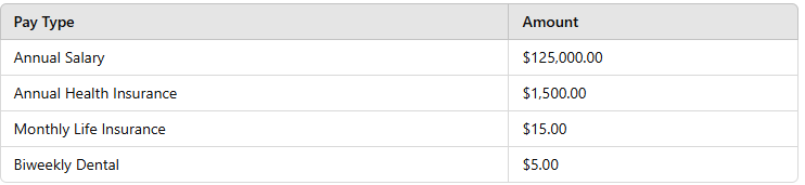 Health Insurance (Biweekly) = ($1,500 26) = $57.69