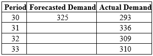 What is the forecast for period 34 if a simple three-period moving average is used?