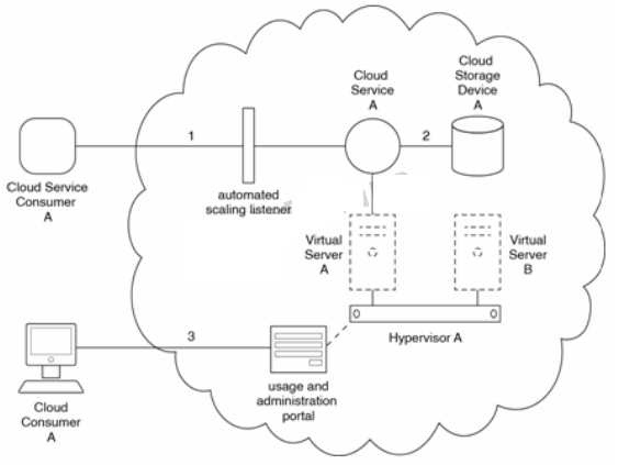 service consumers are intercepted by an automated scaling listener that automatically routes subsequent requests to additional instances of Cloud Service A whenever the given usage of an instance exceeds two concurrent requests.