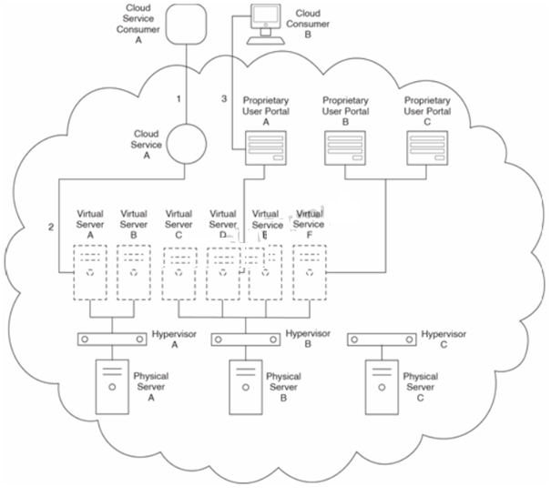 Cloud Service Consumer A accesses Cloud Service A (1), which accesses files stored in a folder on Virtual Server A (2). Cloud Consumer B uses Proprietary User Portal A to administer legacy software (not shown) installed on Virtual Server D (3). Proprietary User Portal B and Proprietary User Portal C are also available for accessing additional legacy systems located on Virtual Server F; however, they are not often used.