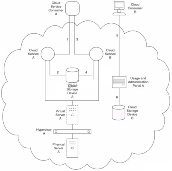 Cloud Service A and Cloud Service B perform different functions but both share access to Cloud Storage Device A when fulfilling requests from cloud service consumers that require data access.