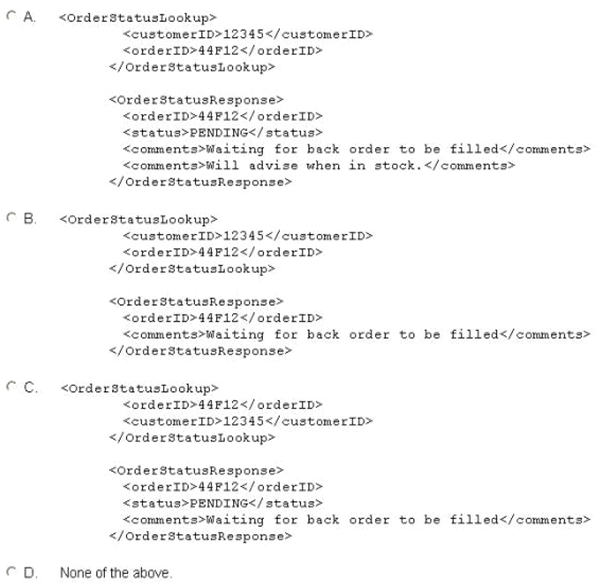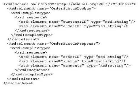 Your company has developed a service that allows your customers to check the status of an order. The schema for the service is shown here: