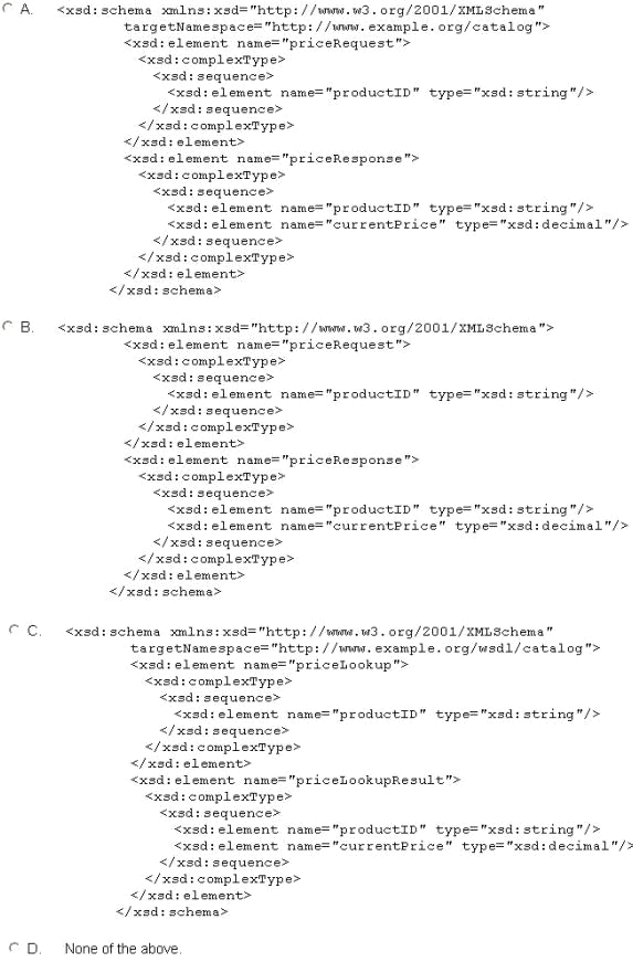 You are given the task of developing an XML schema that defines two messages to work with the WSDL definition shown above. The first message requests a price from the product catalog based on a "productID" element that is a string. The second message is the response, and it returns both the same "productID" element, as well as the price in a "currentPrice" element that is of type decimal. Which of the following schemas accomplishes this?