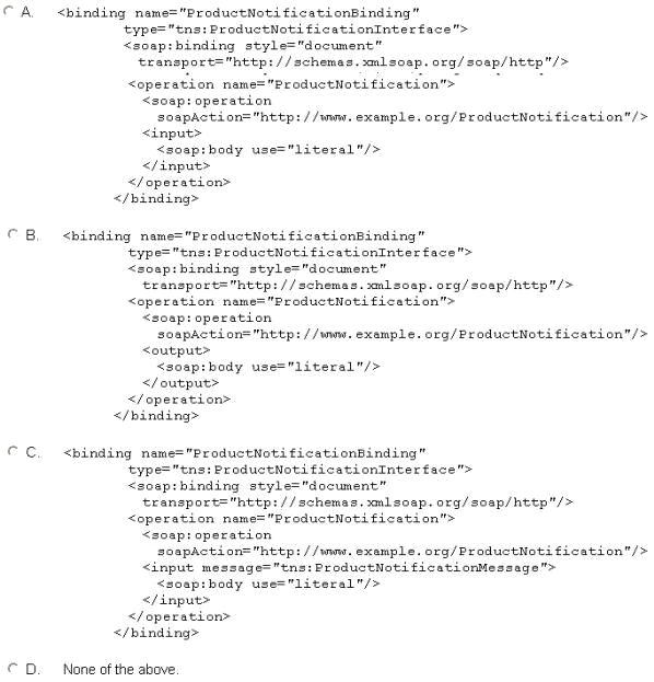 The service has a "ProductNotification" operation that receives a request message containing product information. The receipt of this request message triggers the issuance of a notification to customers. This operation does not issue a response message. Your next task is to define the concrete description for this WSDL definition and you start with the "binding" element. Which of the following represents the correct "binding" element for this WSDL definition?