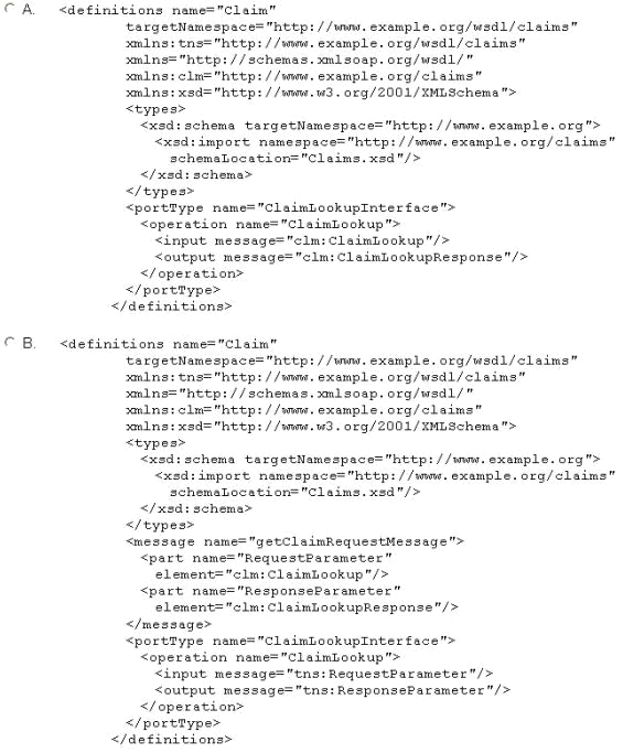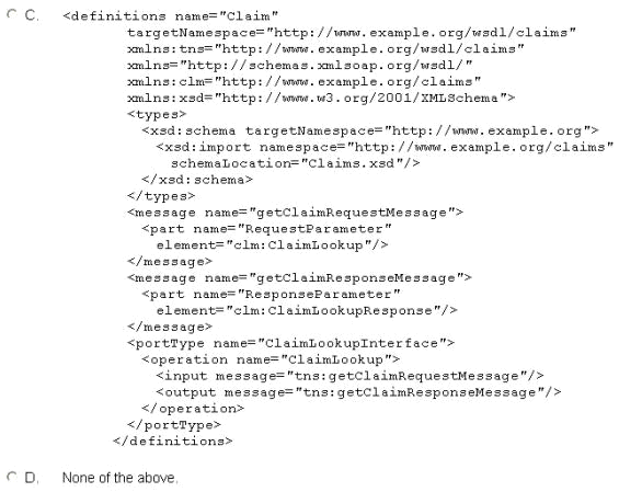 Your next task is to define the WSDL definition for the Claim service. Which of the following WSDL definitions correctly incorporates the above schema?
