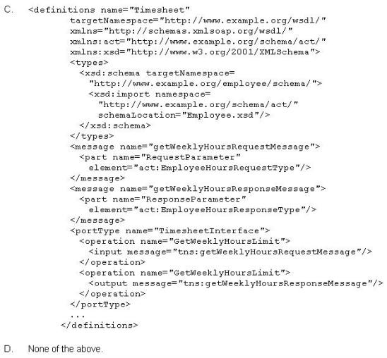 * It must contain a "portType" element called Timesheetlnterface" that contains an "operation" element called "GetWeeklyHoursLimit", an "input" element referencing the request message and an "output" element referencing the response message.Three of your junior developers take on this assignment. At the end of the day, each developer presents you with a different WSDL definition. Which of the following is a correctly designed WSDL definition that also complies with the above instructions?