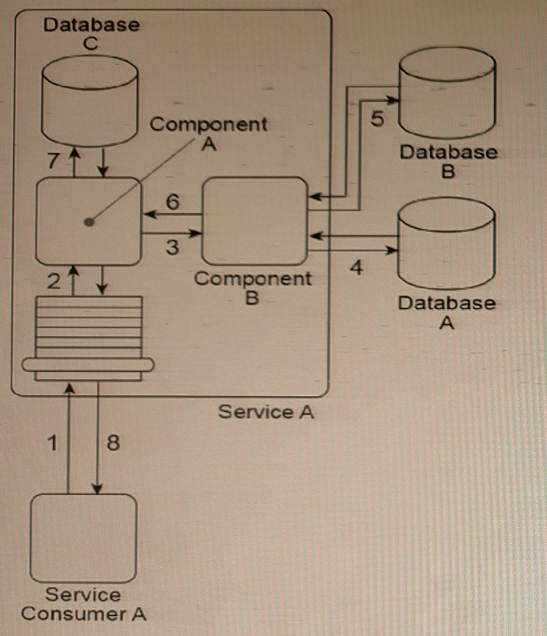 Next, Component B returns the new date* back to Component A (6), which merges it together with the original business document it has been keeping in memory and then writes the combined data to Database C (7). The Service A service capability invoked by Service Consumer A requires a synchronous request-response data exchange. Therefore, based on the outcome of the last database update, Service A returns a message with a success or failure code back to Service Consumer A (8).