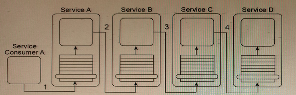 Service Consumer A sends a message to Service A (1), which then forwards the message to Service B (2). Service B forwards the message to Service C (3), which finally forwards the message to Service D (4). However, Services A, B and C each contain logic that reads the contents of the message to determine what intermediate processing to perform and which service to forward the message to. As a result, what is shown in the diagram is only one of several possible runtime scenarios.