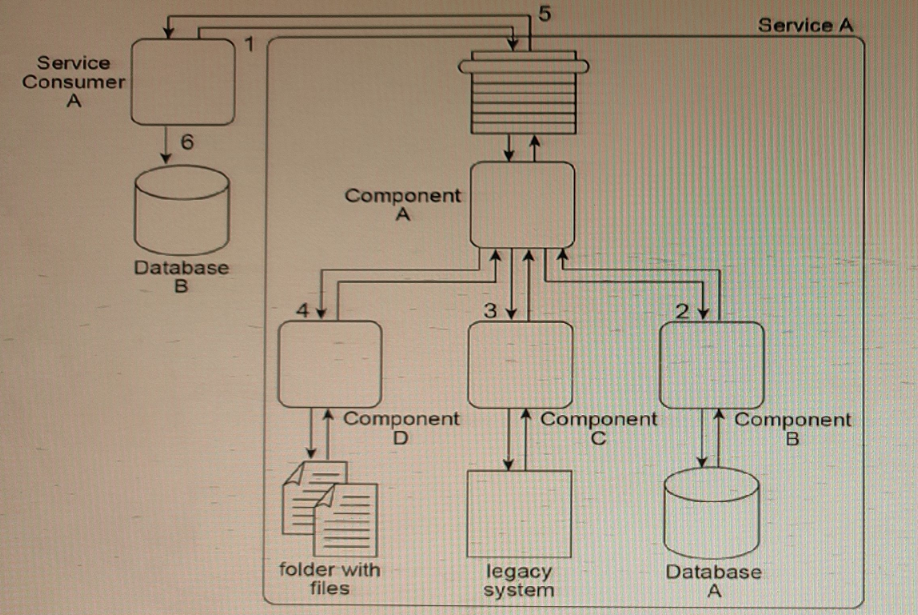 When Service A receives a message from Service Consumer A (1), the message is processed by Component