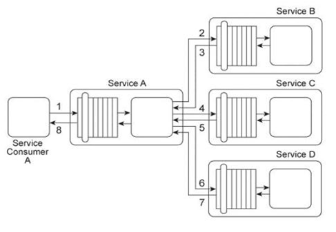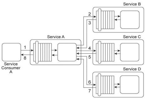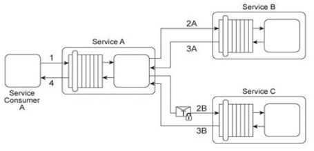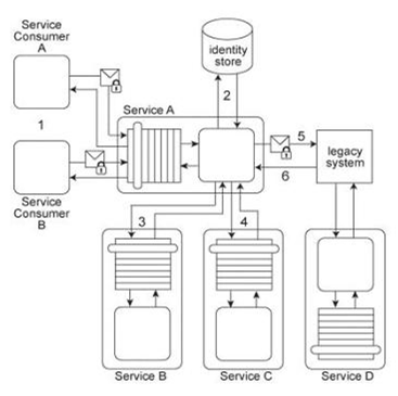 Service A has two specific service consumers, Service Consumer A and Service Consumer B (1). Both service consumers are required to provide security credentials in order for Service A to perform authentication using an identity store (2). If a service consumer's request message is successfully authenticated, Service A processes the request by exchanging messages with Service B (3) and then Service C (4). With each of these message exchanges, Service A collects data necessary to perform a query against historical data stored in a proprietary legacy system. Service A's request to the legacy system must be authenticated (5). The legacy system only provides access control using a single account. If the request from Service A is permitted, it will be able to access all of the data stored in the legacy system. If the request is not permitted, none of the data stored in the legacy system can be accessed. Upon successfully retrieving the requested data (6), Service A generates a response message that is sent back to either Service Consumer A or B .The legacy system is also used independently by Service D without requiring any authentication. Furthermore, the legacy system has no auditing feature and therefore cannot record when data access from Service A or Service D occurs. If the legacy system encounters an error when processing a request, it generates descriptive error codes. This service composition architecture needs to be upgraded in order to fulfill the following new security requirements: