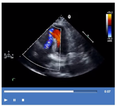 The echocardiographic video shows a defect in the ventricular septum with left-to-right shunting consistent with an ischemic ventricular septal defect (VSD), a mechanical complication of myocardial infarction. The defect allows blood flow between the left and right ventricles.