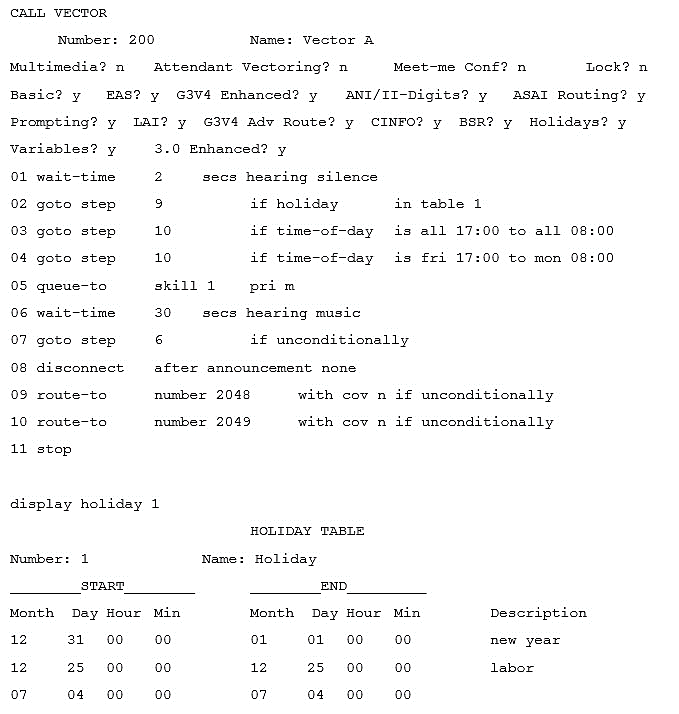 Given the information in the exhibit, what happens to a call if someone calls this vector on Tuesday January 1 at 10:00?