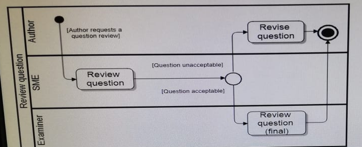 An exam provider employs a number of professionals as authors authors to write exam question for industry-recognised qualifications. An author who has written an exam question submits it for review to a subject matter expert (SME), who either confirms it is acceptable and passes it to the examiner for final review and sign-off, or responds to the author with commands regarding the revision required.