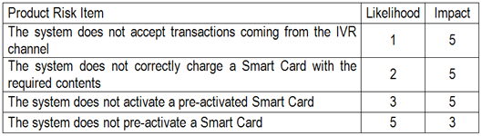 EX1. The test suite for the product must ensure that at least each quality risk item is covered by at least one test case (a quality risk item can be covered by more test cases).