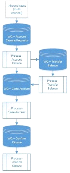 The Transfer Balance process works its queue and, for each successfully processed case, adds case to the Close Account queue.