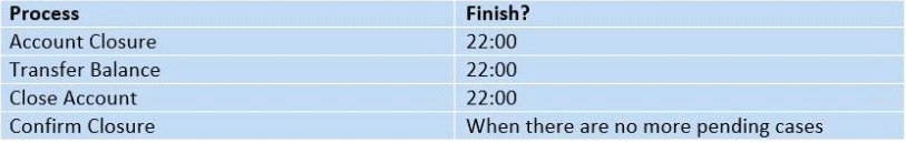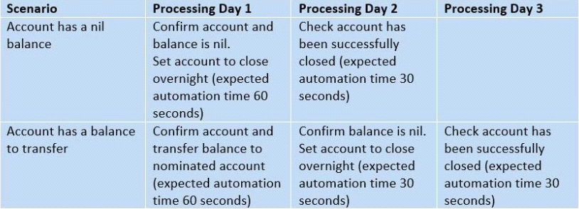 VivaBank have an account closure process that can take up to three days to close an account. All requests within the bank's core system to close an account take place overnight during batch processing. There are two scenarios: