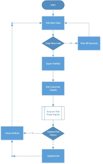 For each case the process will access the customer account in the HotRisk system and, where an account exists, harvest the data which will be fed along with the Work Queue data into a rules engine. The rules engine is a Blue Prism process that does not interact with any target system. It merely consumes data and. via a complicated series of decision and choice stages, determines the new customer risk factor.