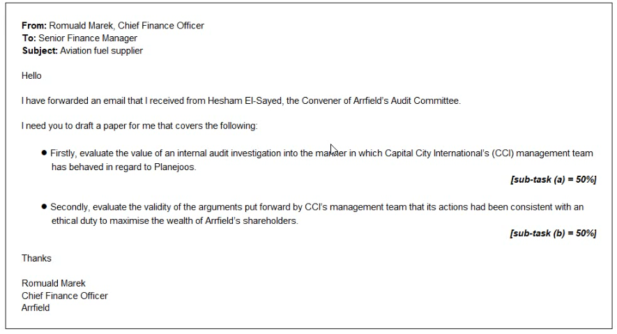 ''Your report was really helpful, but the Board is still considering the implications of that email from Jan Archibald at Fouce Oil. I need to make a more detailed report to the Board and I would like you to draft it for me.