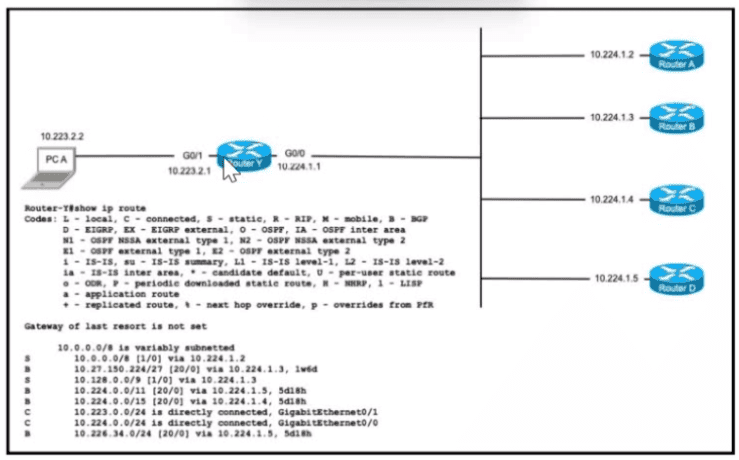 PC A is communicating with another device at IP address 10.227.225.255. Through which router does router Y route the traffic?