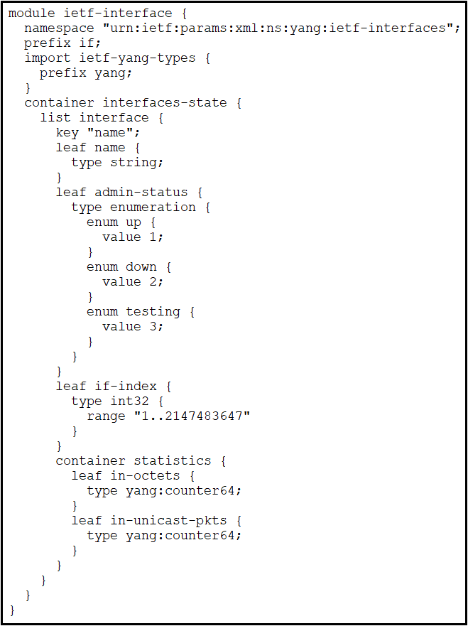 The YANG model provided in the exhibit defines the structure for interface information, including fields for name, admin-status, if-index, and statistics. The correct XML snippet must match this structure and use the appropriate namespaces and field names as defined in the YANG model.