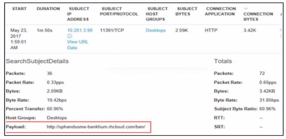 Cisco Secure Network Analytics (Stealthwatch) detects Command-and-Control (C2) activity by analyzing network behavior, not by relying solely on known malicious indicators. In the exhibit, the critical investigative clue is the HTTP payload containing a suspicious external URL, which strongly suggests outbound communication from an internal host to an external command-and-control infrastructure.