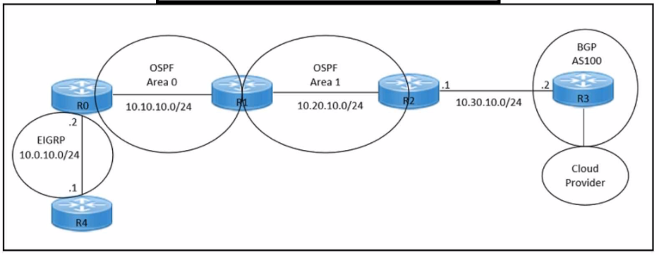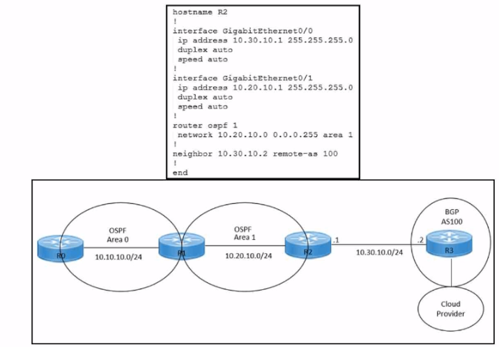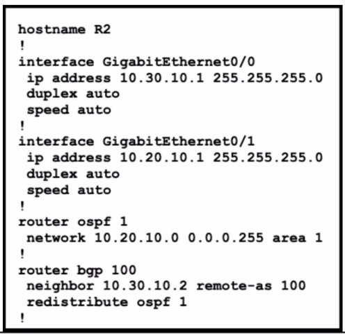 The commandredistribute ospf 1 match externalis missing on router R2. This command is needed to redistribute only the external OSPF routes into BGP. The external OSPF routes are those that are learned from another routing protocol or redistributed into OSPF. In this case, the 10.0.10.0/24 network is an external OSPF route, as it is redistributed from EIGRP into OSPF on router R1. The other commands are either already present or not relevant for this scenario.Reference:=