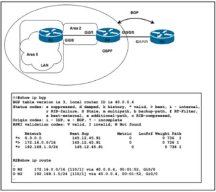 a. R5 announces only the 0.0.0.0/0 route to R4 via BGP. R4 is configured with redistribute bgp 736 metric-type 2. After the most recent maintenance window. R2 no longer has the default route via R4. Which action must the network engineer take to correct the reachability problem?
