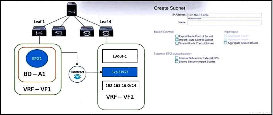 Refer to the exhibit. The external subnet and internal EPG1 must communicate with each other, and the L3Out traffic must leak into the VRF named "VF1". Which configuration set accomplishes these goals?