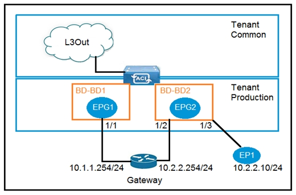 An engineer wants to avoid connectivity problems for the endpoint EP1 when it reaches an external L3Out network through the gateway 10.2.2.254/24. Which two configurations must be implemented in BD-BD2? (Choose two.)