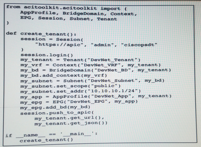 Refer to the exhibit, which two actions does this Python code perform with the Cisco ACI? (Choose two.)