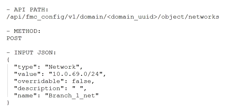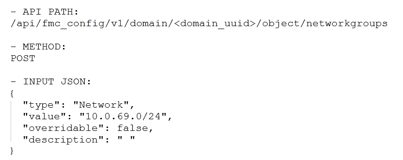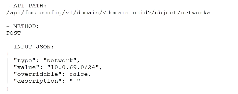Which snippet is used to create an object for network 10.0.69.0/24 using Cisco Firepower Management Center REST APIs?