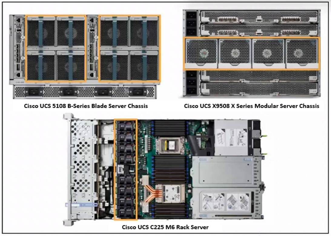 The highlighted components in all three Cisco UCS server models (5108 B-Series Blade Server Chassis, X9508 X Series Modular Server Chassis, and C225 M6 Rack Server) are fan modules, which are field-replaceable units responsible for cooling the system.