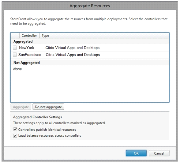 Two StoreFront servers are deployed in each data center aggregating resources from the Delivery Controllers in the respective data center.