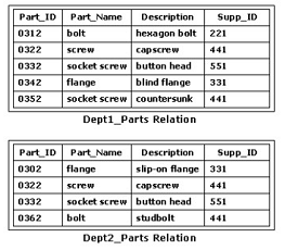 Consider the Dept1_Parts and Dept2_Parts relations shown in the exhibit. Which of the