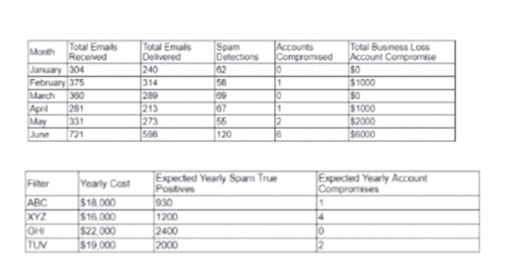 A cybersecurity analyst created the following tables to help determine the maximum budget amount the business can justify spending on an improved email filtering system:
