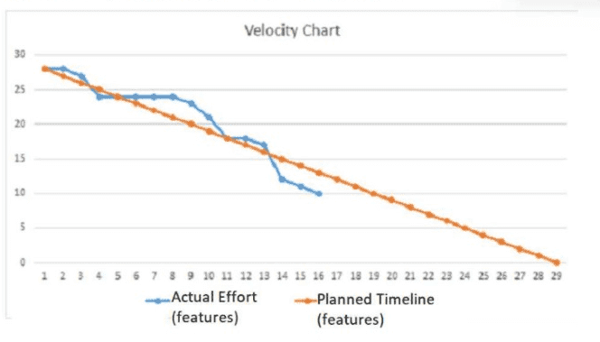 The velocity chart typically shows the amount of work completed over time. If the ''Actual Effort'' line is below the ''Planned Timeline,'' it indicates that the project is not progressing as fast as planned, hence it is behind schedule. This is inferred by comparing the actual work completed against what was scheduled.