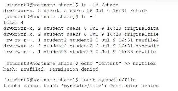 By default, when a user creates a file or directory, it is owned by the user and assigned the user's primary group, not necessarily the group of the parent directory. As shown in the output, files inside /share are owned by different groups (student, student2, student3), which prevents other group members from modifying them, even though the parent directory is group-writable.