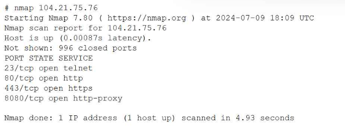 This scenario falls under the Security domain of the CompTIA Linux+ V8 objectives and focuses on system hardening and service minimization. The Nmap scan output reveals that port 23 (Telnet) is open on the system, which represents a significant security risk.
