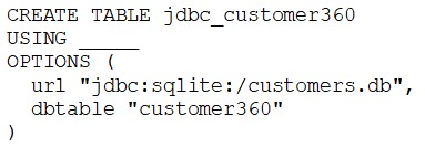 : In the given command, a data engineer is trying to create a table in Databricks using data from an SQLite database. The correct option to fill in the blank is ''sqlite'' because it specifies the type of database being connected to in a JDBC connection string. TheUSINGclause should be followed by the format of the data, and since we are connecting to an SQLite database, ''sqlite'' would be appropriate here.Reference: